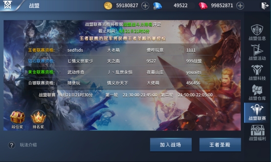 (5)战盟联赛:这里是不同战盟进行角逐较量的地方,证明自己战盟比其他战盟更加强大,胜者会有丰厚奖励。