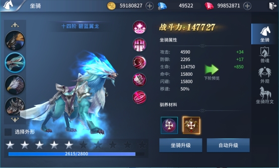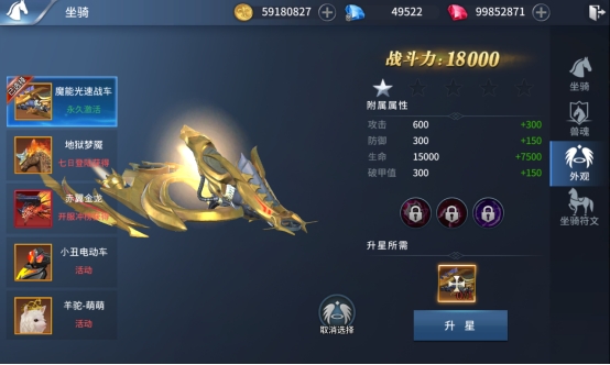 (3)外观:玩家可以通过多种途径获得坐骑外观,可以覆盖普通坐骑外观,并且有战斗力加成。