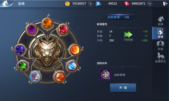 (2)坐骑兽魂:提升坐骑的兽魂等级,可增加属性和战斗力。