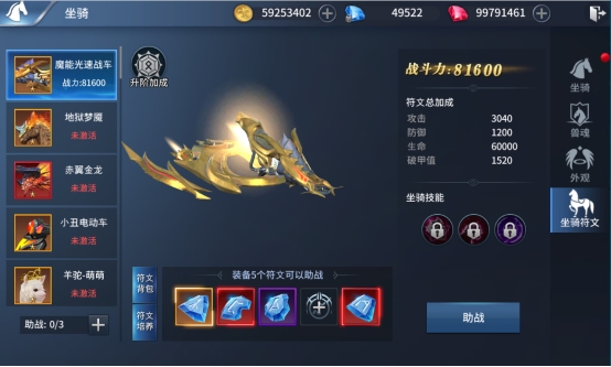 坐骑系统分坐骑、兽魂、外观、坐骑符文4个功能。