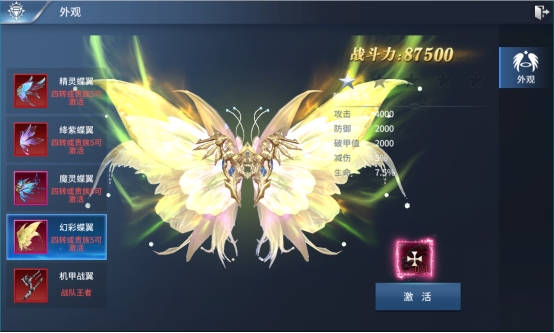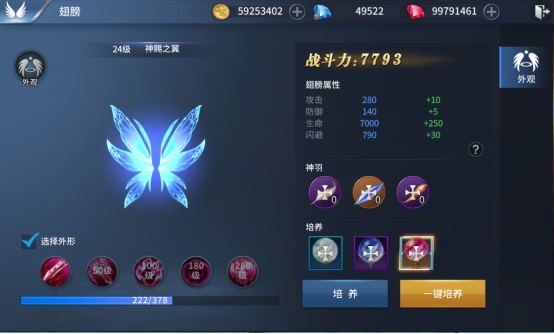 (2)翅膀外观:翅膀除了基础升级时的外观以外,还可以通过一些途径获得更加酷炫的稀有翅膀外观。