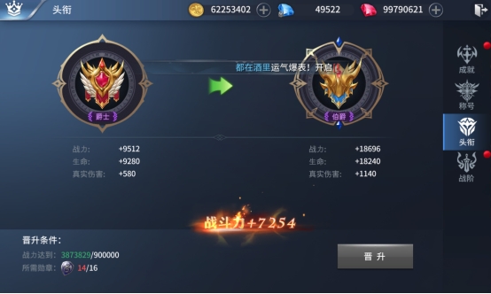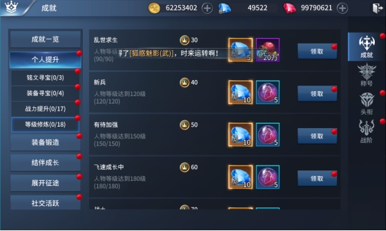 成就系统是玩家游戏过程中,达到高度的证明,分别有成就、称号、头衔、战阶4类来鼓励玩家前进