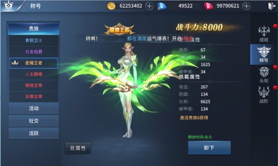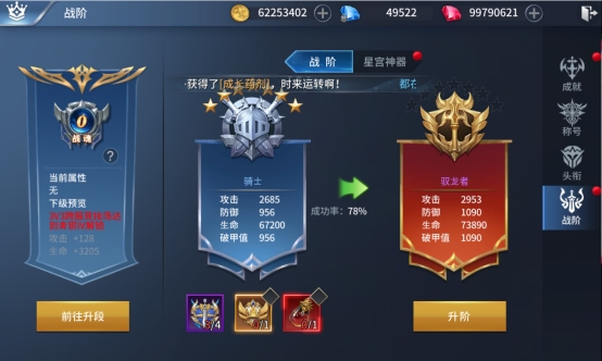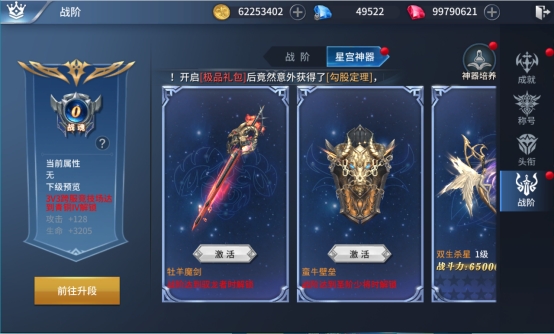 (4) 战阶:玩家通过提升自己的战阶来获得额外的属性,以及解锁星宫神器。