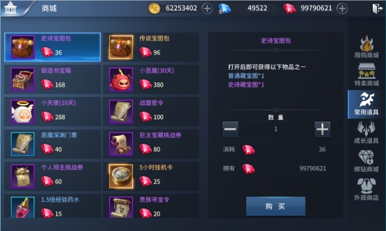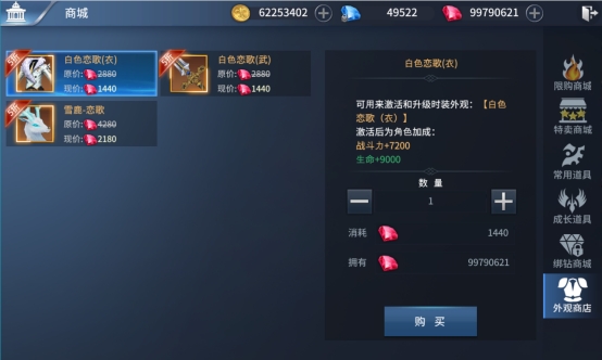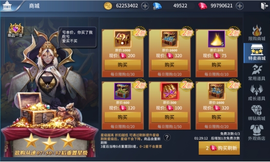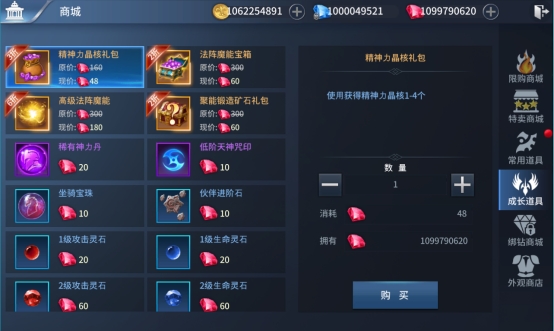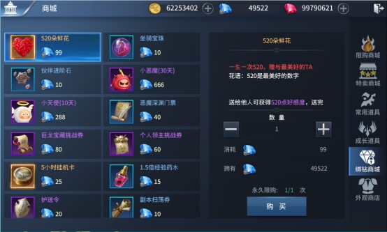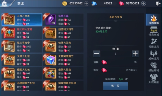 商城是出售游戏物品的窗口。其中分“限购商品”“特卖商城”“常用道具”“成长道具”“绑钻商城” 和“外观商店”