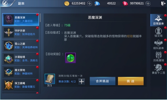 达到一定的等级,即会开放相应等级的副本。副本中会掉落指定的成长材料。副本每天有进行次数限制。个别副本需要消耗材料门票