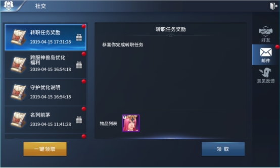 (2)邮件:系统给与玩家各种补偿和奖励时会通过邮件的形式发放,注意,玩家之间是不能用邮件进行互相通讯的。