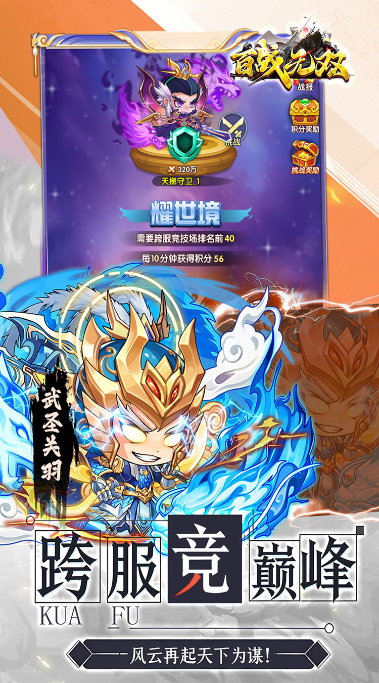 执掌天命者,当立不世之功!《百战无双》是一款以三国为题材的放置卡牌策略游戏。玩家将化身三国主公,招募历史名将,通过策略布阵、武将养成和阵营搭配,体验热血征伐与智谋博弈。游戏融合了放置挂机、跨服竞技等多元玩法,搭配精致卡通画风与沉浸式战斗效果,重现三国巅峰时代的史诗对决。